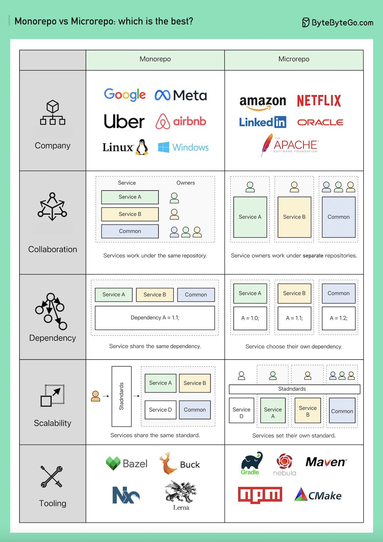 Monorepo 并不新颖;Linux 和 Windows 都是使用 Monorepo 创建的。为了提高可扩展性和构建速度,Google 开发了内部专用工具链,以更快进行扩展,并制定严格的编码质量标准以保持一致性。