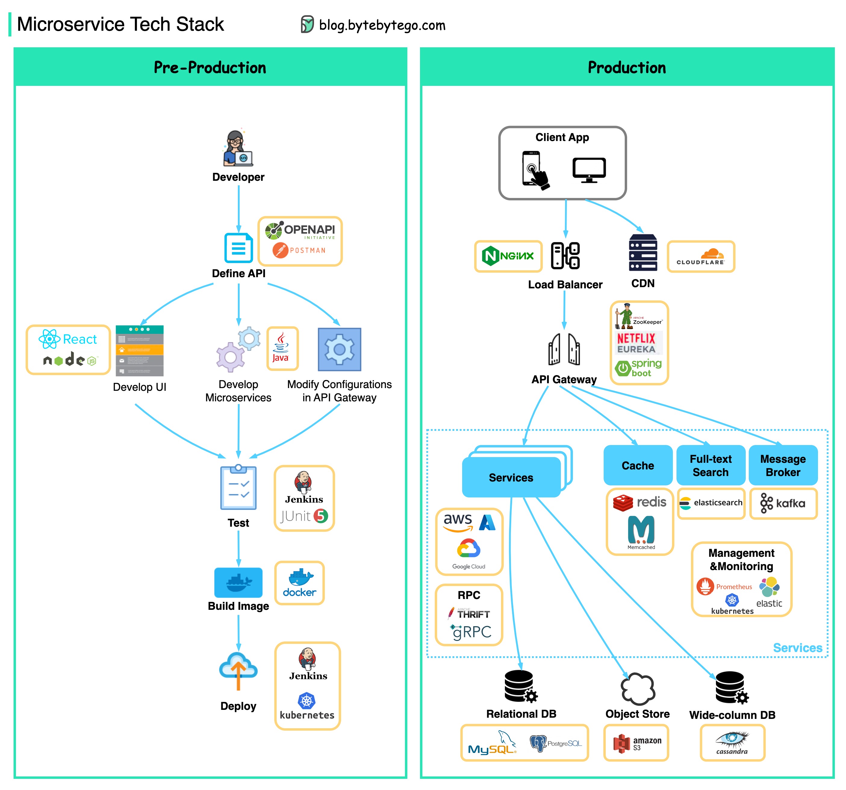 下面您会看到一个图示,展示了微服务的技术栈,分别是开发阶段和生产阶段。